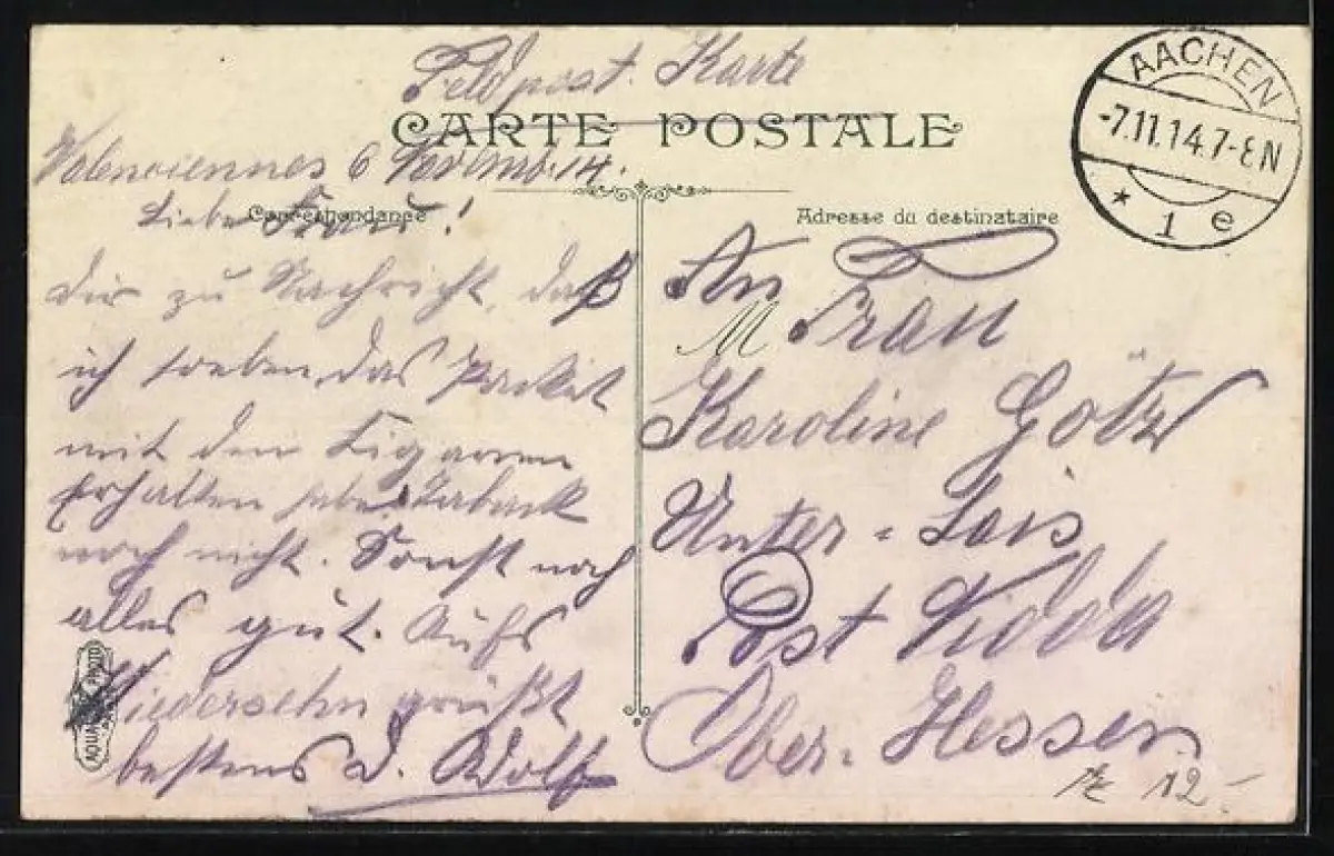 alte Ansichtskarte, gelaufen 1914, Bugspur mitte, Eckknick li. unten, guter Zustand