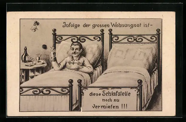 Künstler-AK Infolge der grossen Wohnungsnot ist - diese Schlafstelle noch zu vermieten!!, Erotik