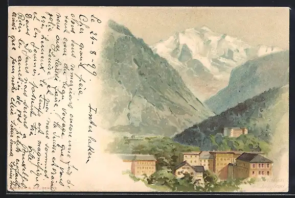 Künstler-AK Interlaken, Teilansicht mit Jungfrau