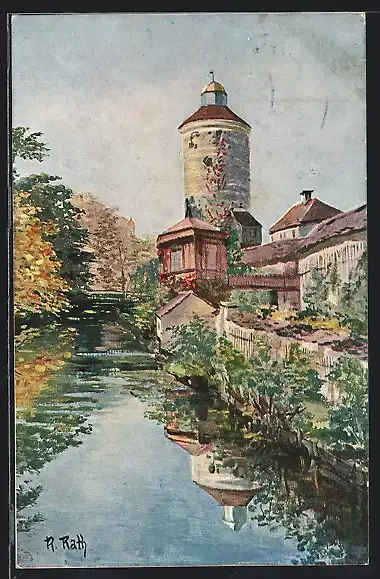 Künstler-AK Isny, Spätsommer-Idyll am Fluss mit Turm