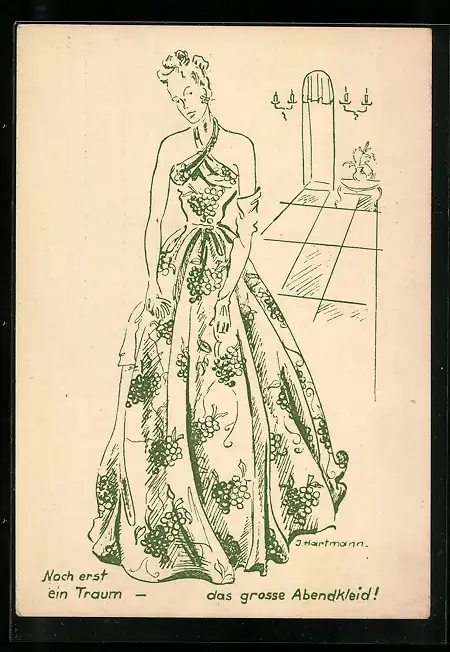 Künstler-AK J. Hartmann, Junge Frau im Abendkleid, Reklame Mode Kleidung