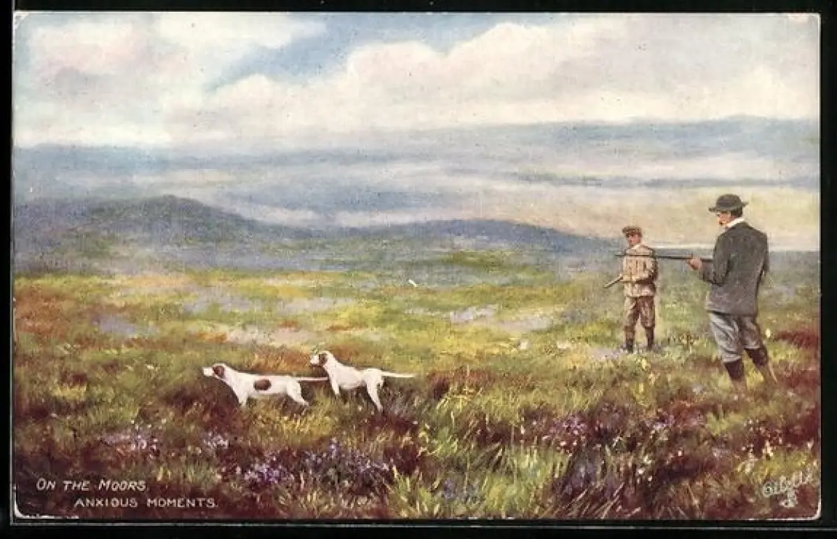 Künstler-AK Jäger mit Gewehren und Jagdhunden auf der Pirsch