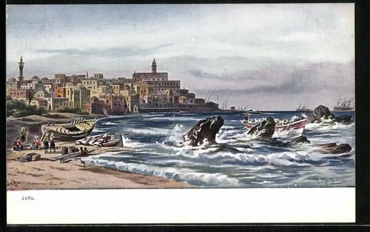 Künstler-AK Jaffa, Felsige Brandung mit Blick zur Stadt
