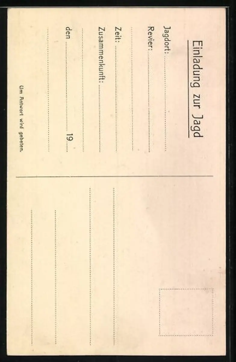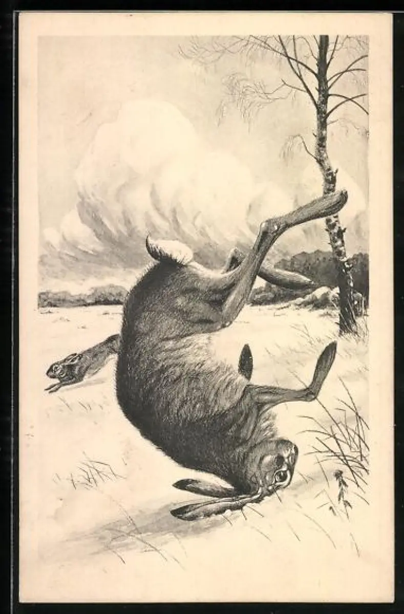 Künstler-AK Jagdeinladung, Von einem Jäger getroffener Hase stürzt aus vollem Lauf