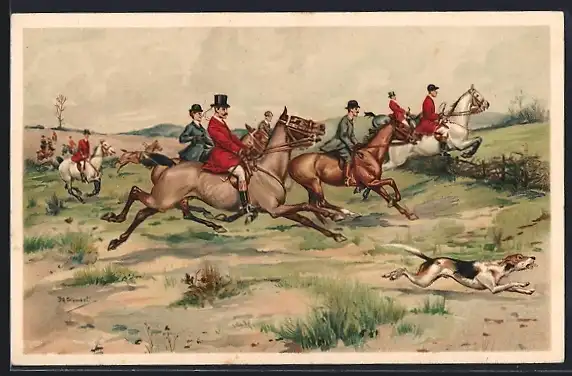 Künstler-AK Jagdgesellschaft mit Hund auf Parforcejagd