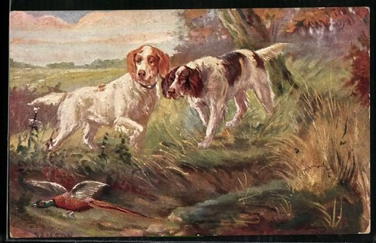 Künstler-AK Jagdhunde und aufgeschreckter Fasan