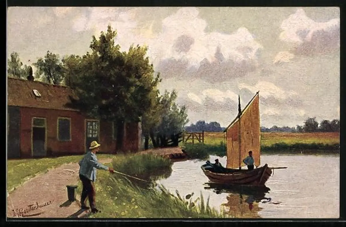 Künstler-AK Johan Georg Gerstenhauer: Angler und zwei Fischer auf einem traditionellen Segelboot