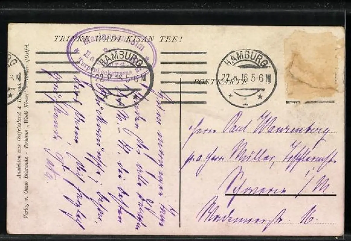 alte Ansichtskarte, gelaufen 1916, Briefmarke entfernt, rückseitig Oberflächenschaden, guter Zustand