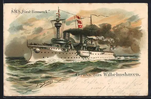 Künstler-AK Johann Georg Siehl-Freystett: S.M.S. Fürst Bismarck, Kriegsschiff des Ostasiengeschwaders auf hoher See