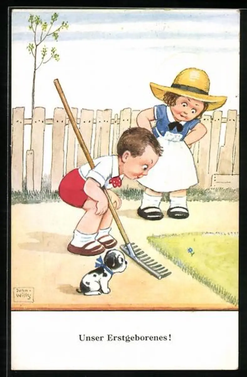 Künstler-AK John Wills: Unser Erstgeborenes!, kleine Gärtner bewundern ein Blümchen