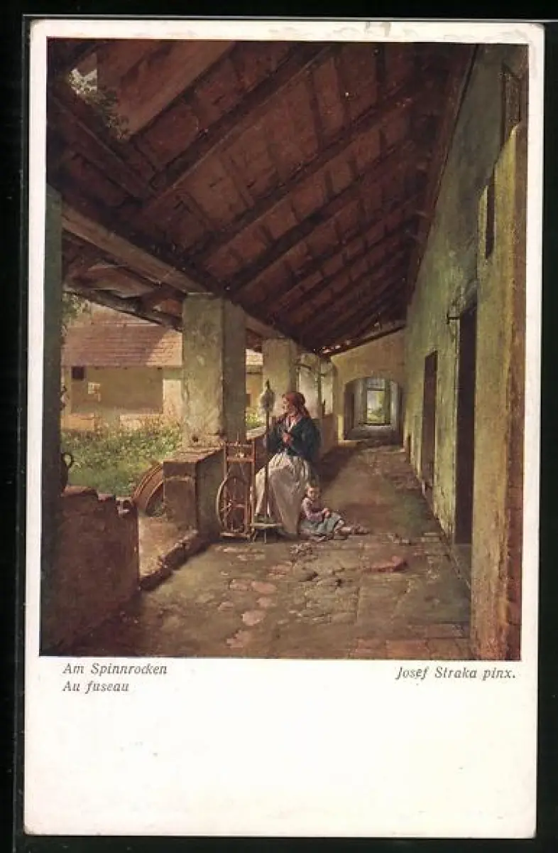 Künstler-AK Josef Straka: Am Spinnrocken, Mutter mit Spinnrad, Kind sitzt am Boden