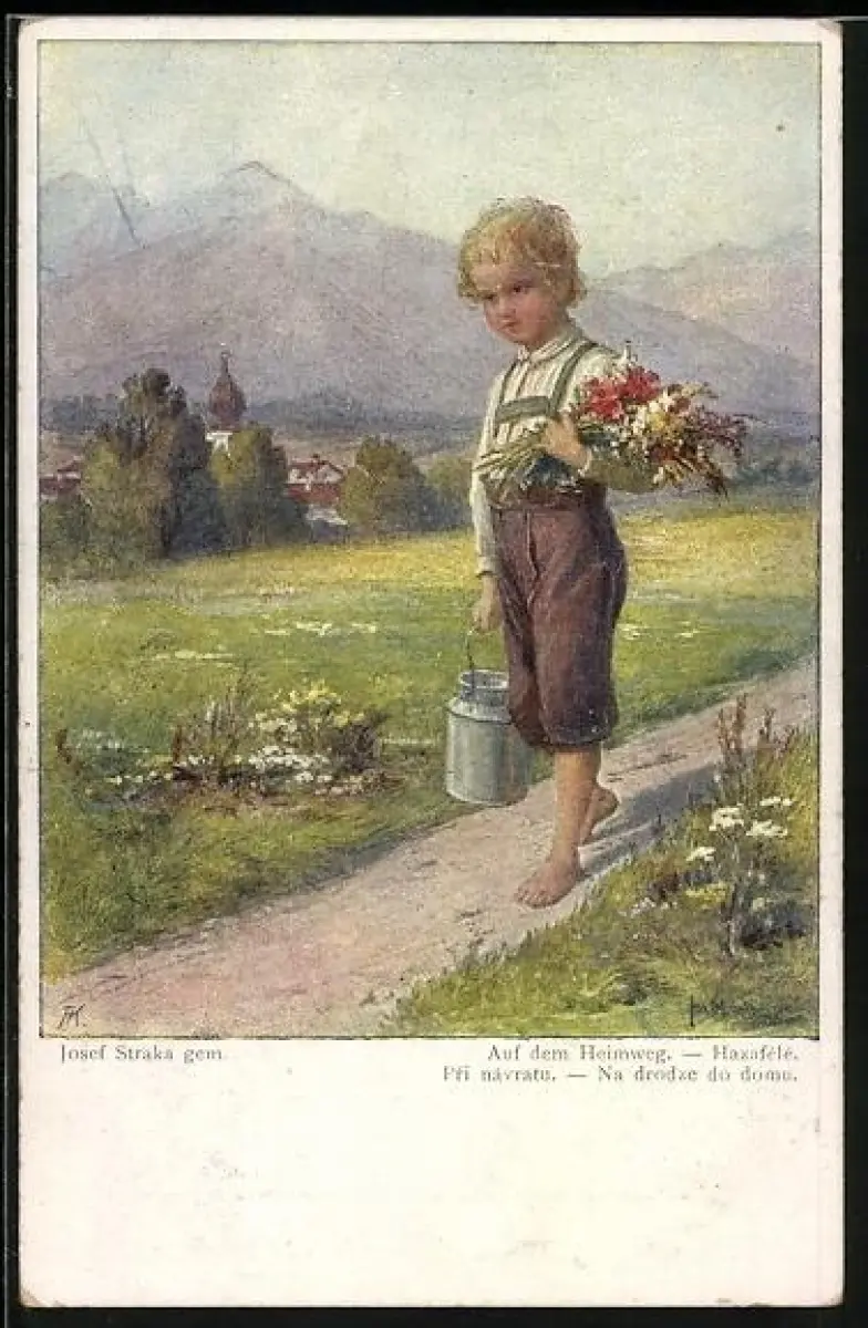 Künstler-AK Josef Straka: Auf dem Heimweg, Knabe in den Bergen mit Milchkanne und Blumen