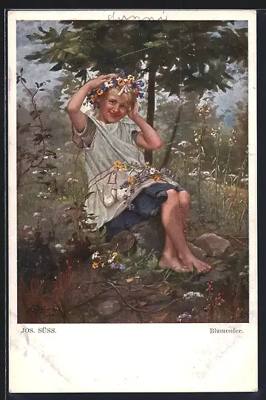 Künstler-AK Josef Süss: Blumenfee, fröhliches Mädchen mit Blumenkranz