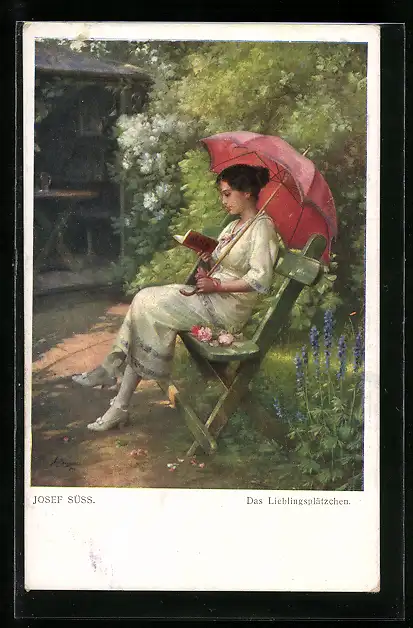 Künstler-AK Josef Süss: Das Lieblingsplätzchen, Junge Dame in Garten