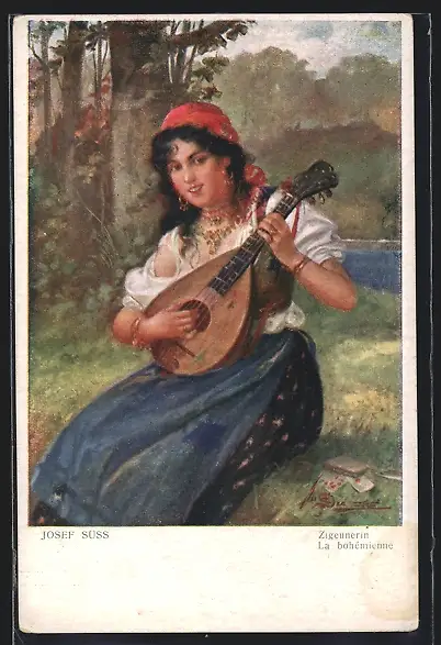 Künstler-AK Josef Süss: Hübsche Zigeunerin spielt auf einer Laute