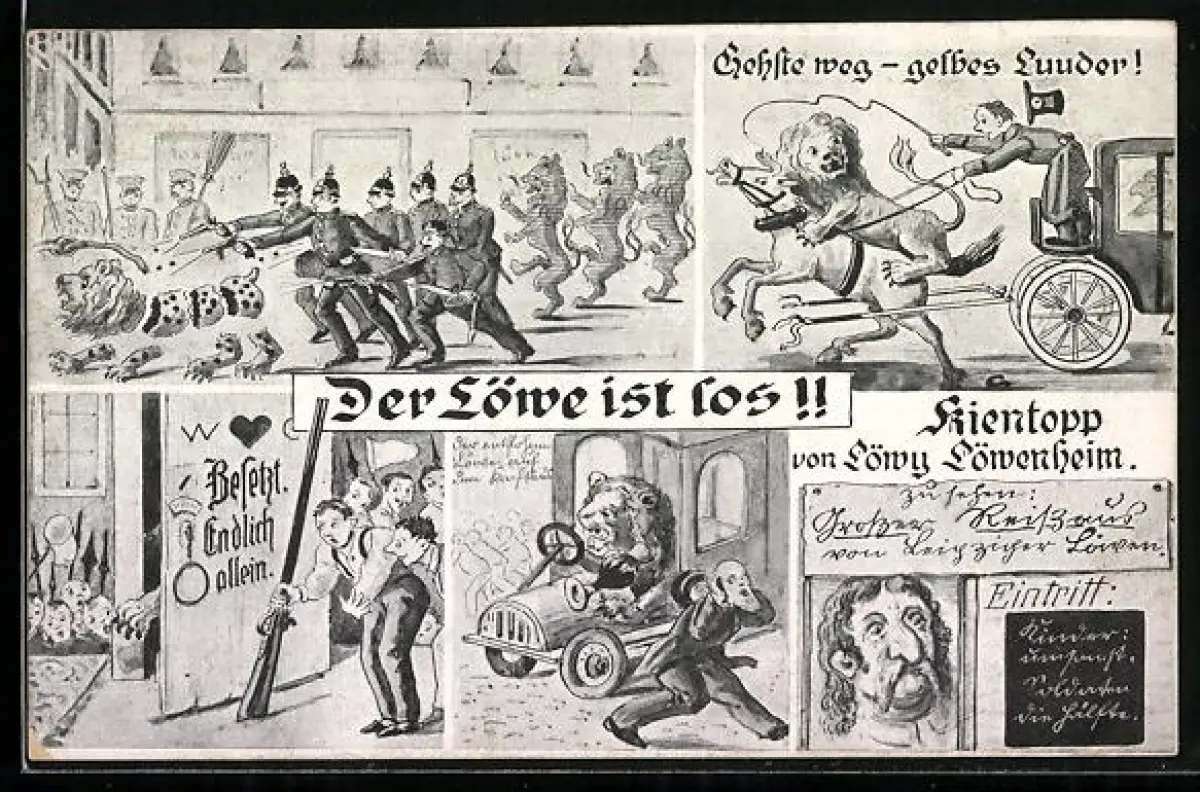 Künstler-AK Jude Kientopp von Löwy, Der Löwe ist los, Polizisten schiessen auf einen Löwen