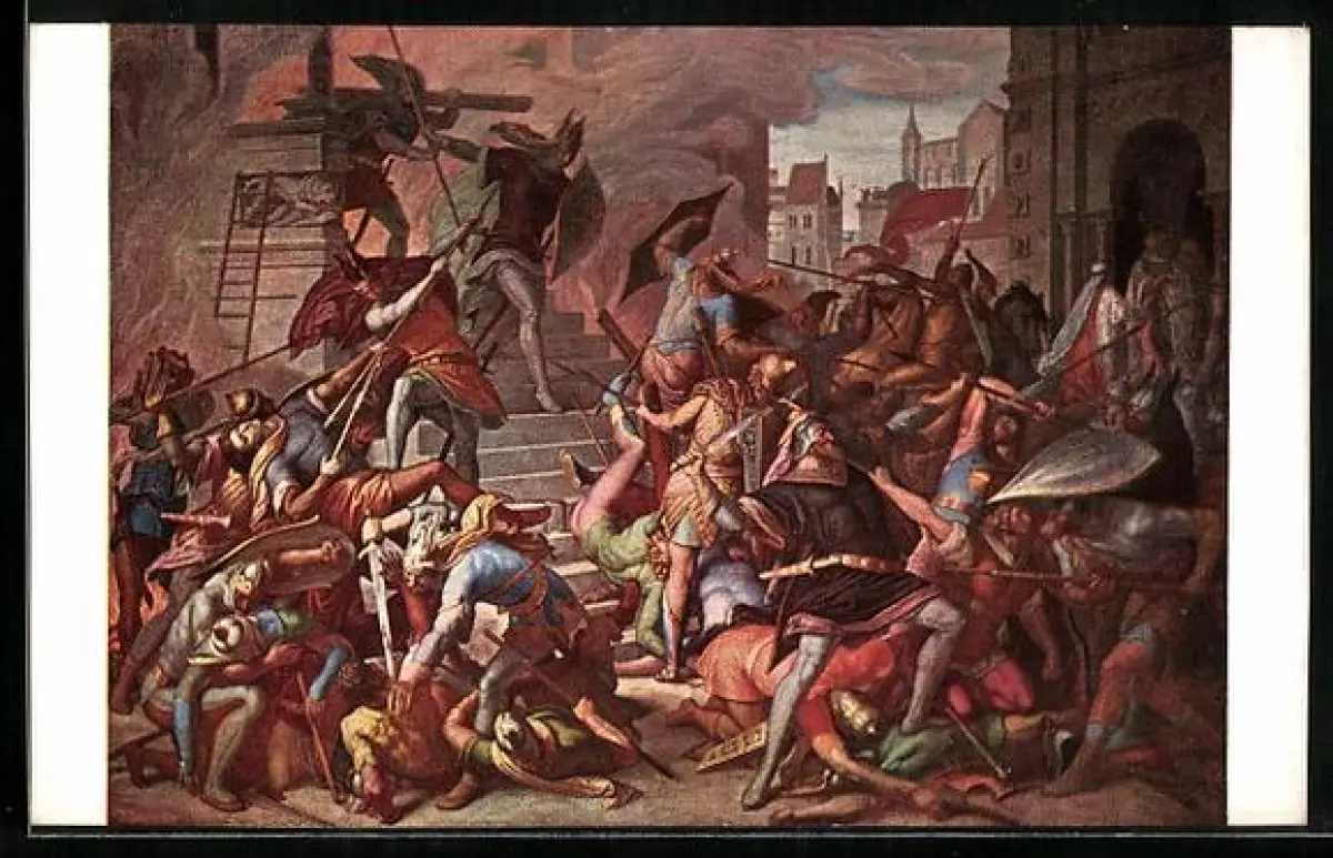 Künstler-AK Julius Schnorr von Carolsfeld: Das Nibelungenlied, Kampf auf der Stiege in Etzels Palast