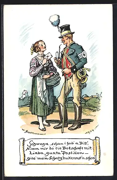 Künstler-AK Junge Frau gibt einen Brief beim Postillon auf