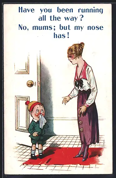 Künstler-AK Junge steht mit laufender Nase vor seiner Mutter