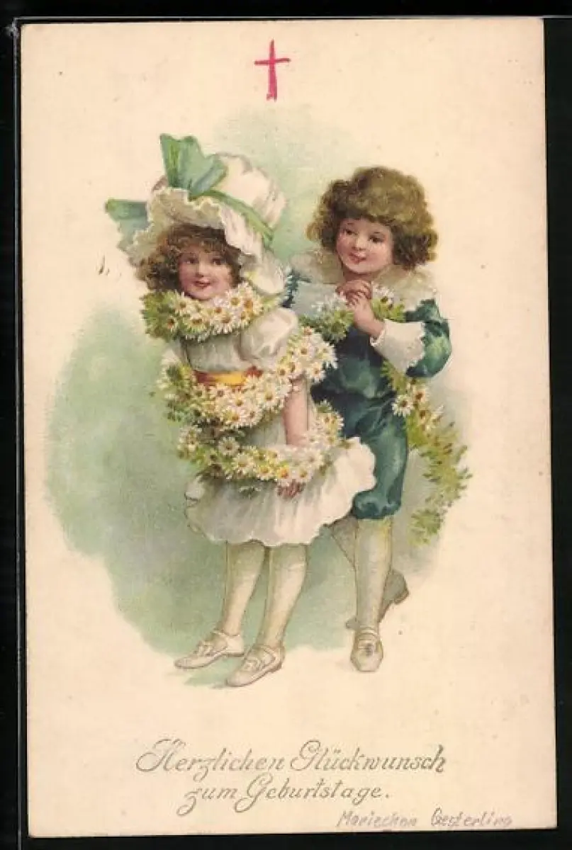 Künstler-AK Junge wickelt Mädchen in eine Blumengirlande, Herzlichen Glückwunsch zum Geburtstage