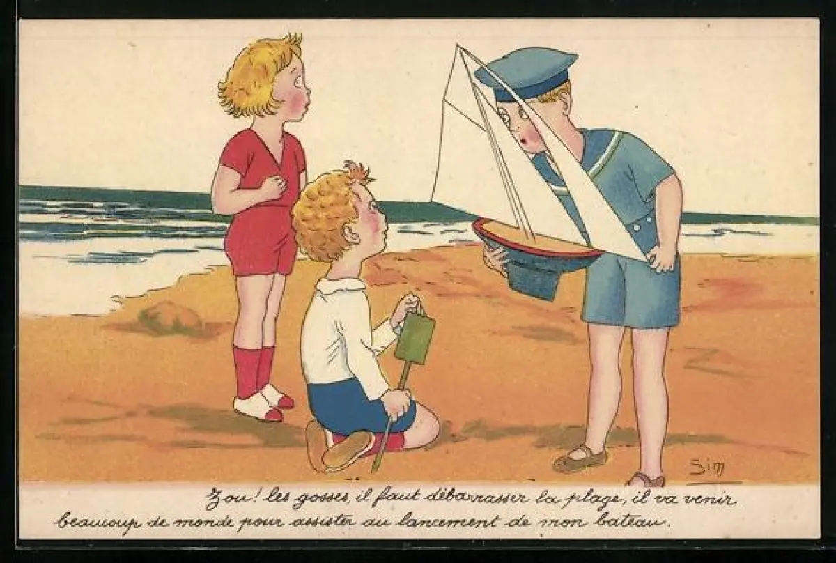 Künstler-AK Junger Matrose mit kleinem Segelboot redet auf Kinder am Strand ein