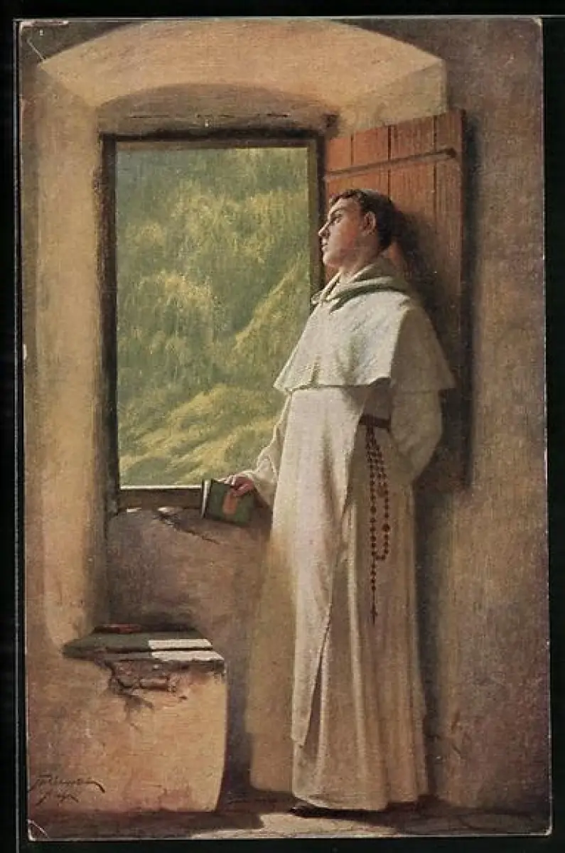 Künstler-AK Junger Mönch schaut aus dem Fenster