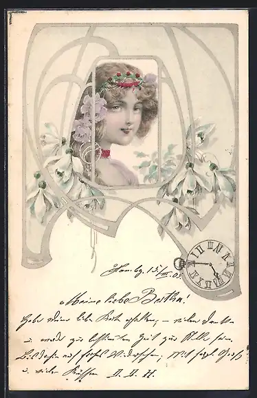 Künstler-AK Junges Mädchen mit lockigem Haar und Kopfschmuck, Jugendstil