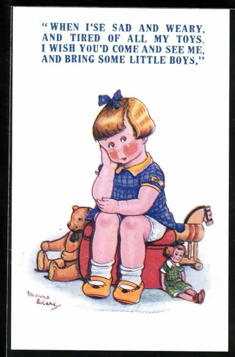 Künstler-AK Junges Mädchen sitzt traurig zwischen ihren Spielzeug