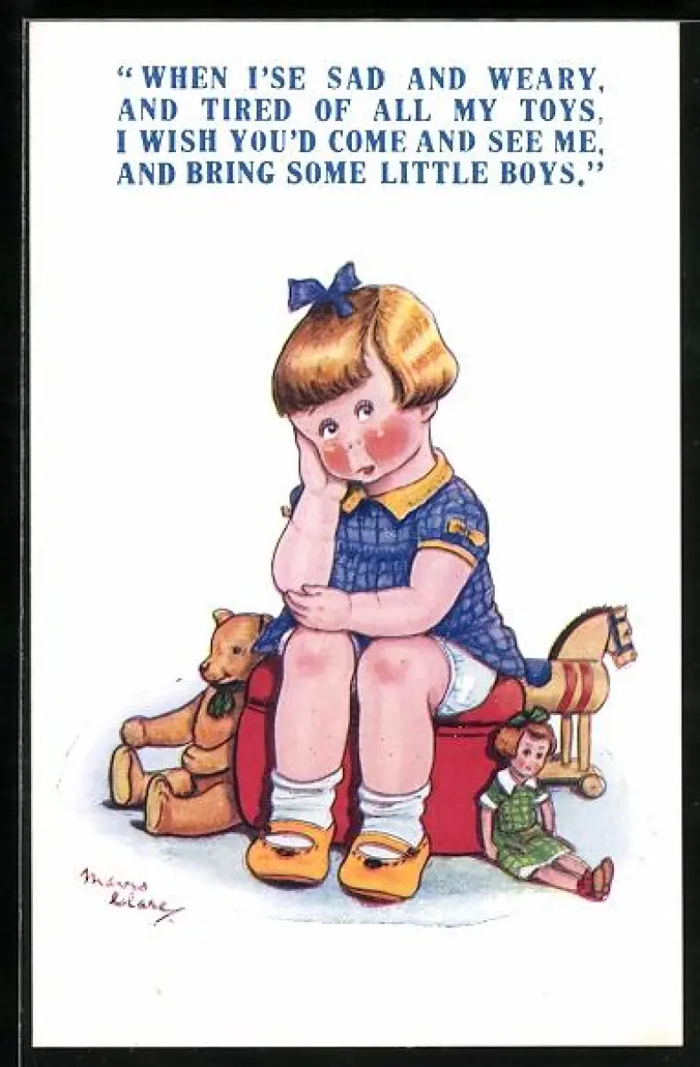 Künstler-AK Junges Mädchen sitzt traurig zwischen ihren Spielzeug