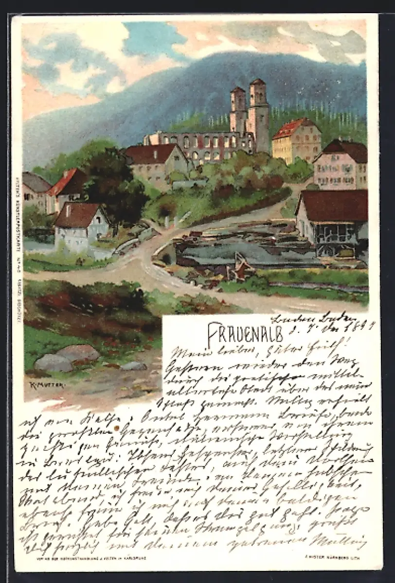 Künstler-AK K. Mutter: Frauenalb, Ortsansicht mit Kirche