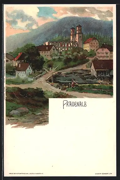 Künstler-AK K. Mutter: Frauenalb, Ortsansicht von oben