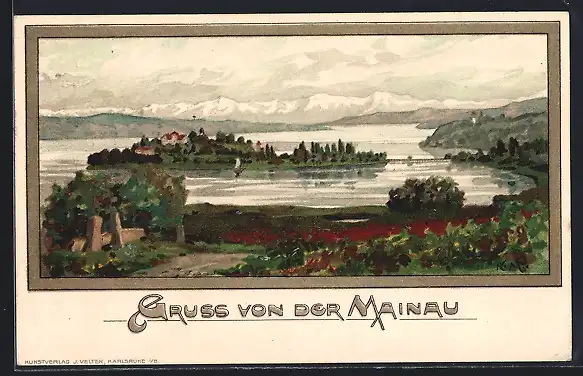 Künstler-AK K. Mutter: Insel Mainau, Blick über den See zur Insel