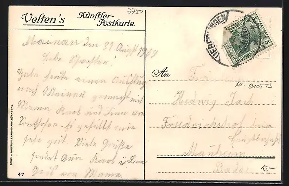 alte Ansichtskarte, gelaufen 1909, Briefmarke entfernt, guter Zustand