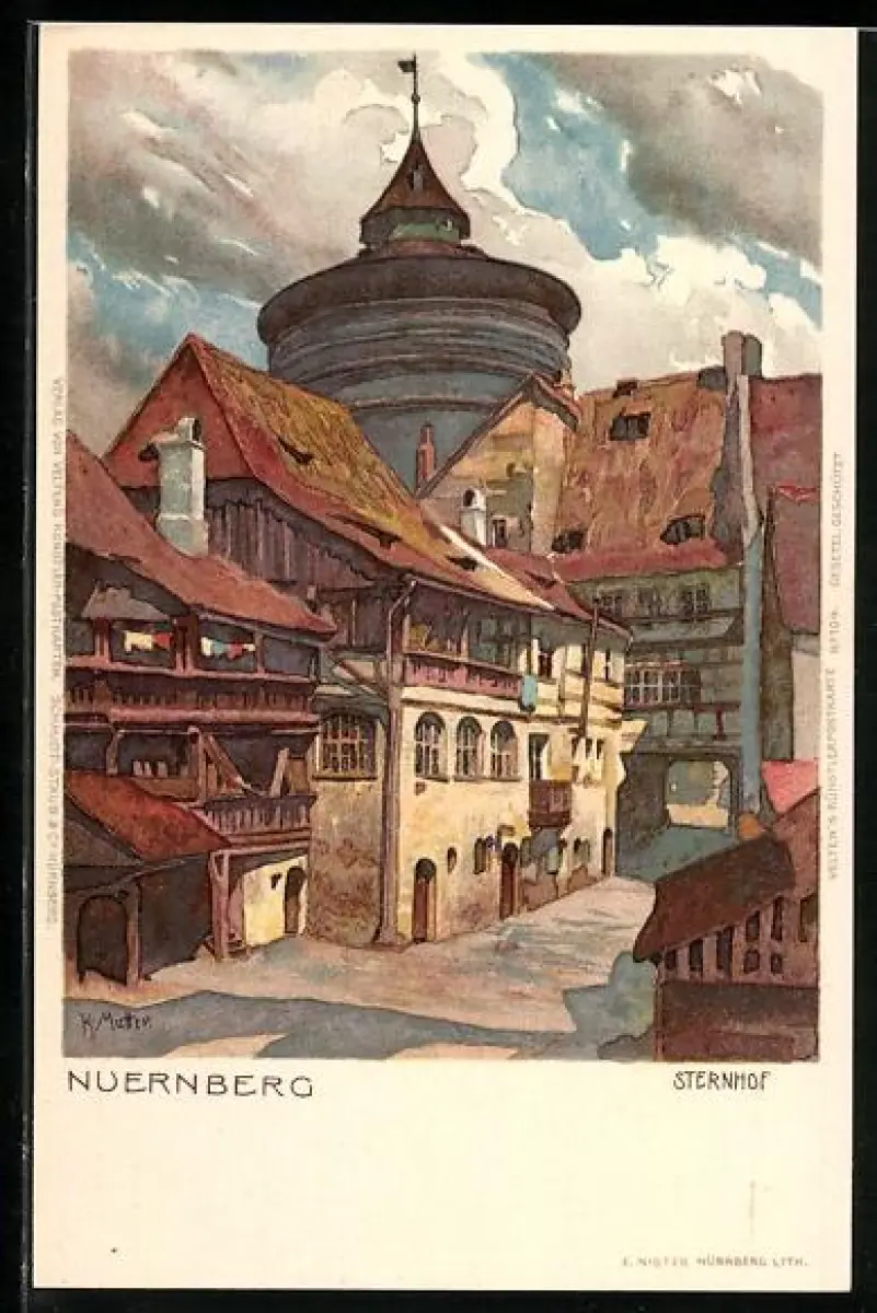 Künstler-AK K. Mutter: Nürnberg, Sternhof mit Turm im Hintergrund