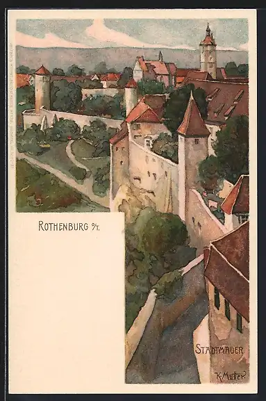 Künstler-AK K. Mutter: Rothenburg / Tauber, Blick entlang der Stadtmauer