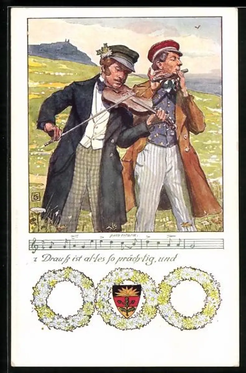 Künstler-AK K.F. Gsur: Musiker mit Geige und Querflöte, Deutscher Schulverein NR: 107