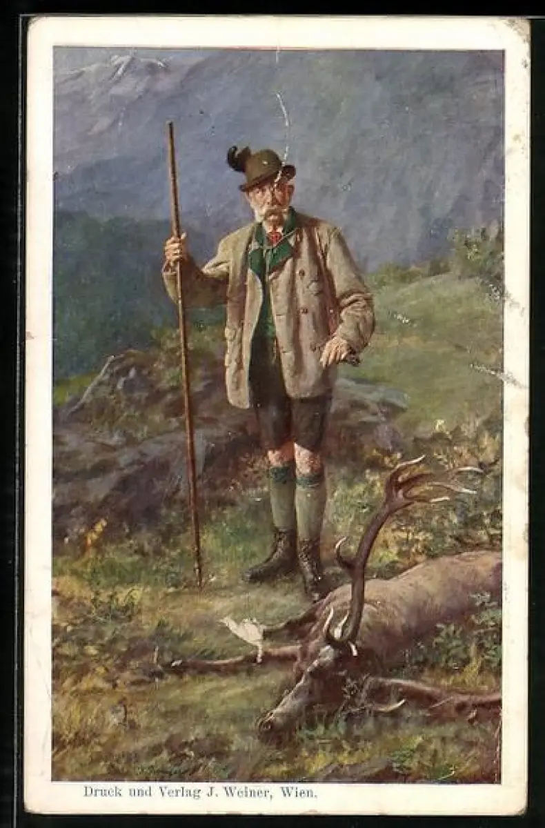 Künstler-AK Kaiser Franz Josef I. von Österreich als Jäger neben dem erlegtem Hirsch