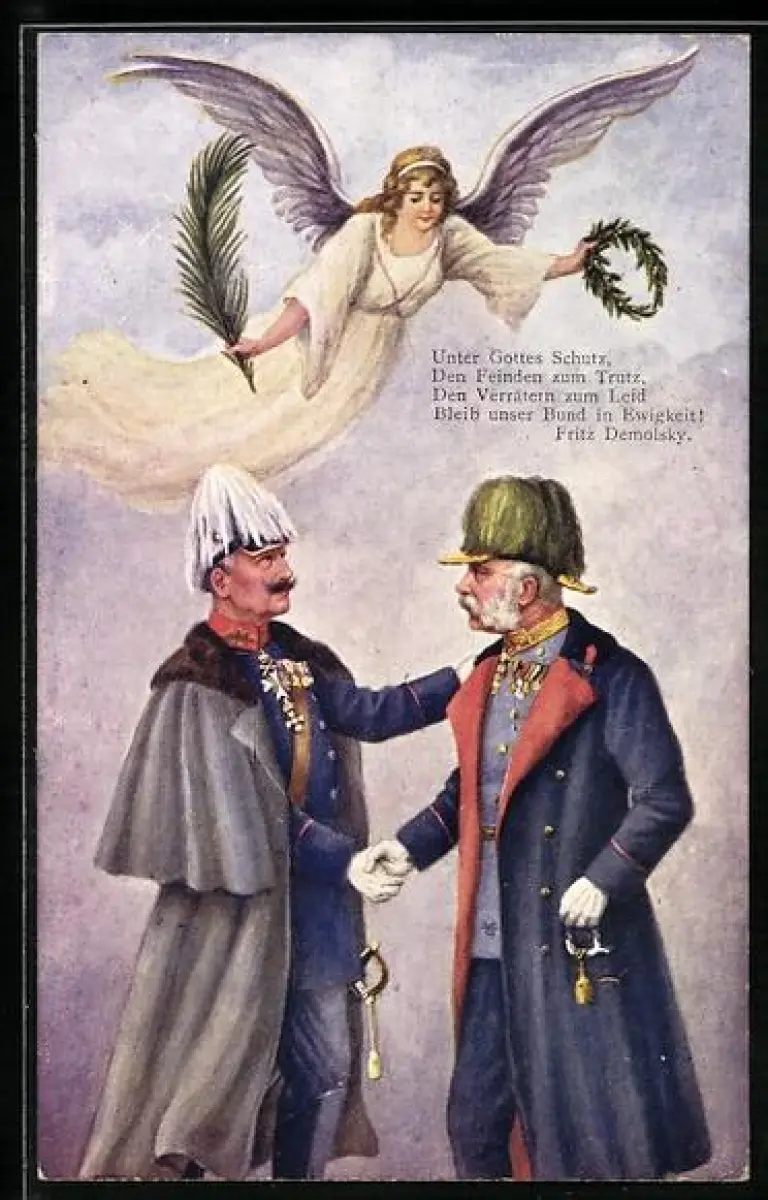 Künstler-AK Kaiser Franz Josef I. von Österreich und Kaiser Wilhelm II. geben sich die Hand