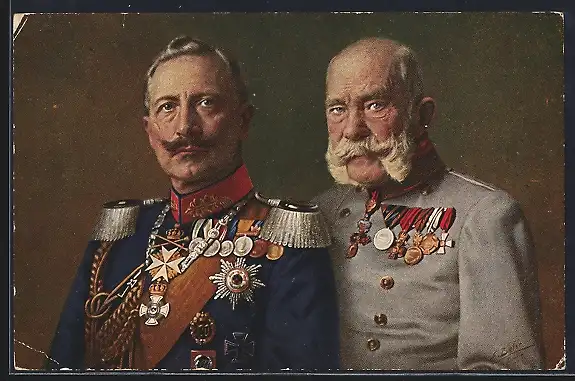 Künstler-AK Kaiser Franz Josef I. von Österreich und Kaiser Wilhelm II. in Uniformen