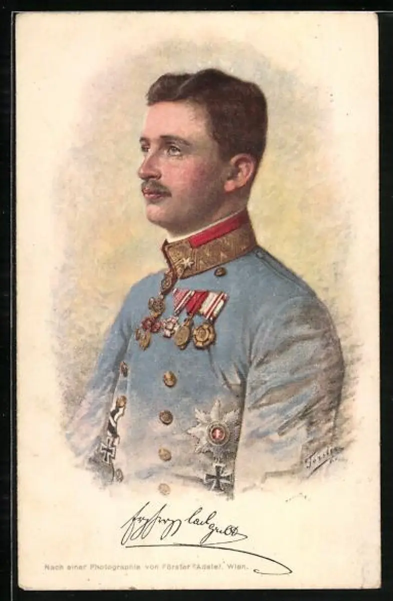 Künstler-AK Kaiser Karl I. von Österreich in Uniform mit Orden, Rotes Kreuz