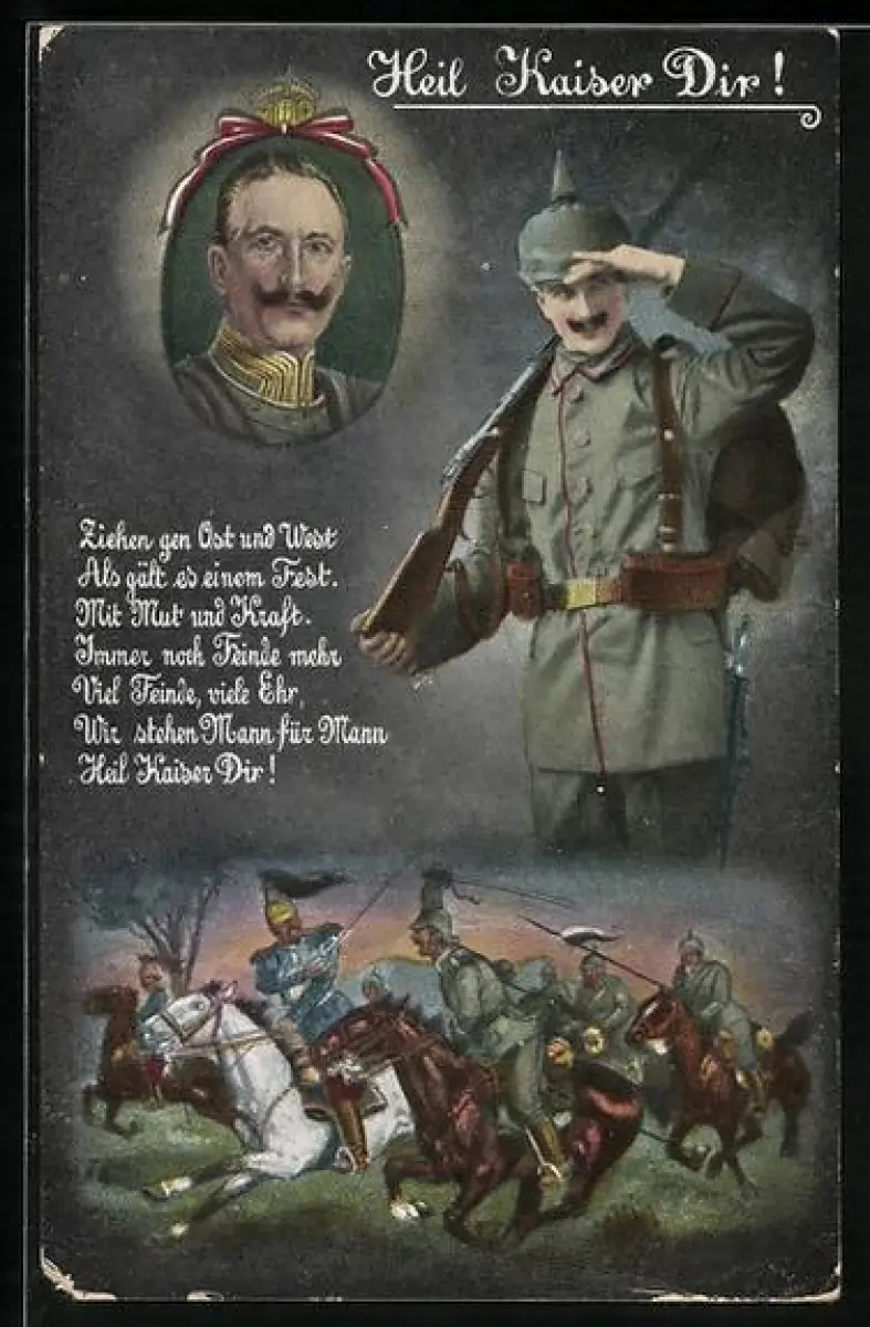 Künstler-AK Kaiser Wilhelm II. im Portrait, Kavallerie im Gefecht