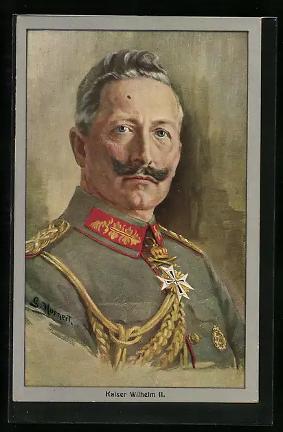 Künstler-AK Kaiser Wilhelm II. in Uniform mit seinem ikonischen Schnurrbart und stoischem Blick
