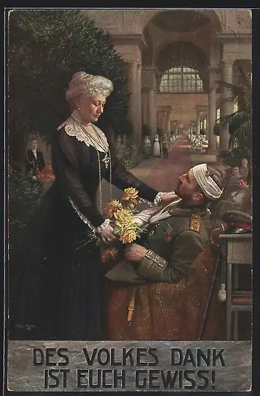 Künstler-AK Kaiserin Auguste Victoria von Preussen auf Truppenvisite im Lazarett, verwundeter Soldat bekommt Blumen