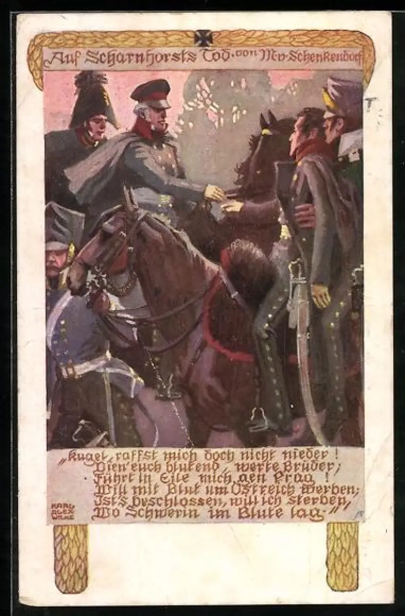 Künstler-AK Karl Alex Wilke: Auf Scharnhorsts Tod von M. v. Schenkendorf, Kugel raffst mich doch nicht nieder!...