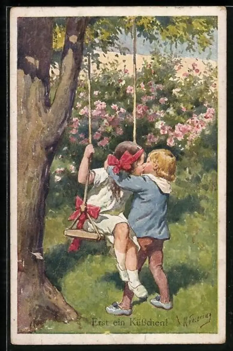 Künstler-AK Karl Feiertag: Erst ein Küsschen, Junge küsst ein Mädchen, das auf einer Schaukel sitzt