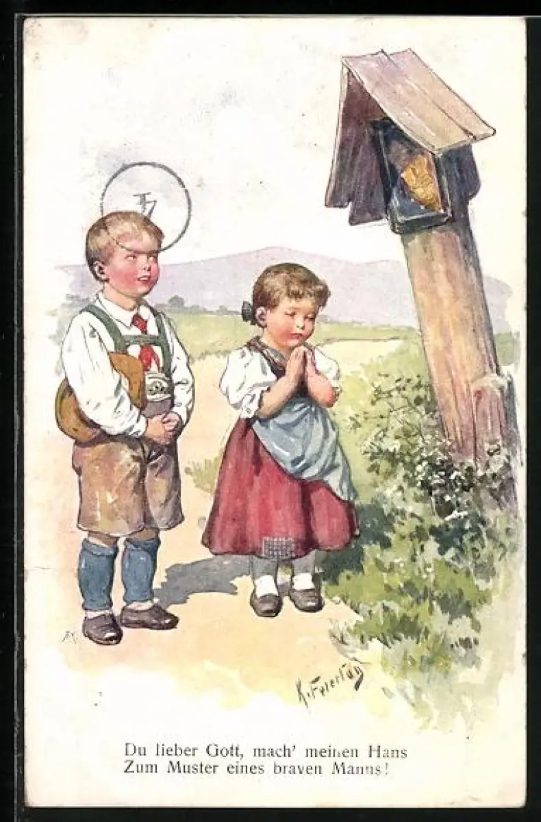 Künstler-AK Karl Feiertag: Junge u. Mädchen in bayerischen Trachten beim Gebet am Flurkreuz
