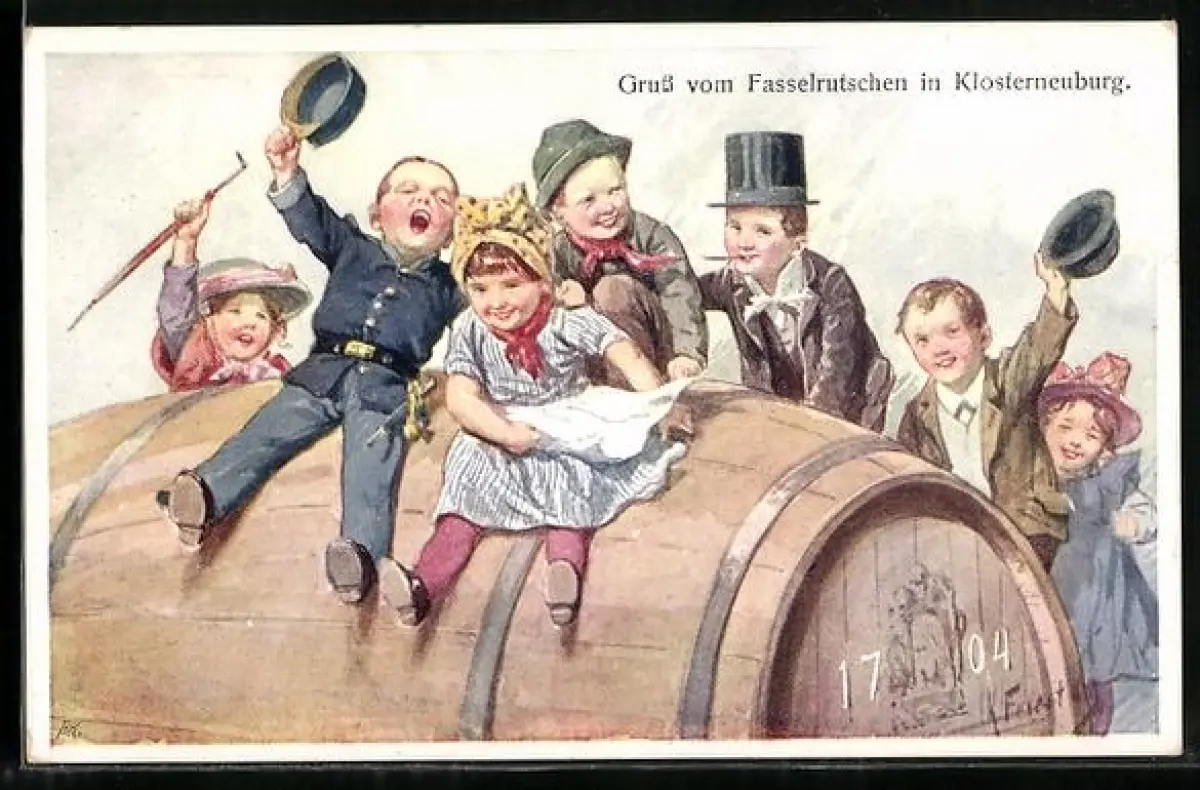 Künstler-AK Karl Feiertag: Klosterneuburg, Gruss vom Fasselrutschen