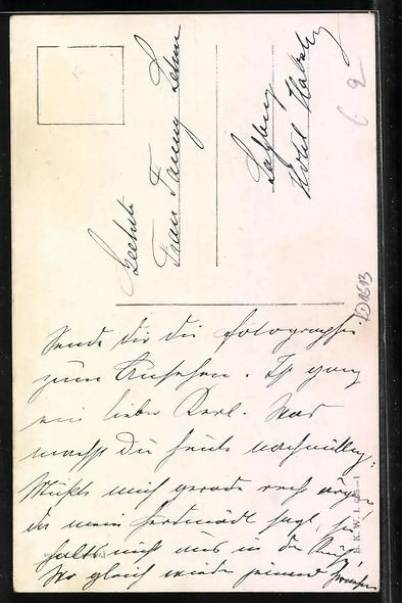 Personenbezogene Daten auf der Rückseite der Karte wurden durch blauen Textmarker unkenntlich gemacht. Die blauen Stellen sind auf die Vorderseite durchgeweicht und wirken sich negativ auf das Postkartenfoto aus