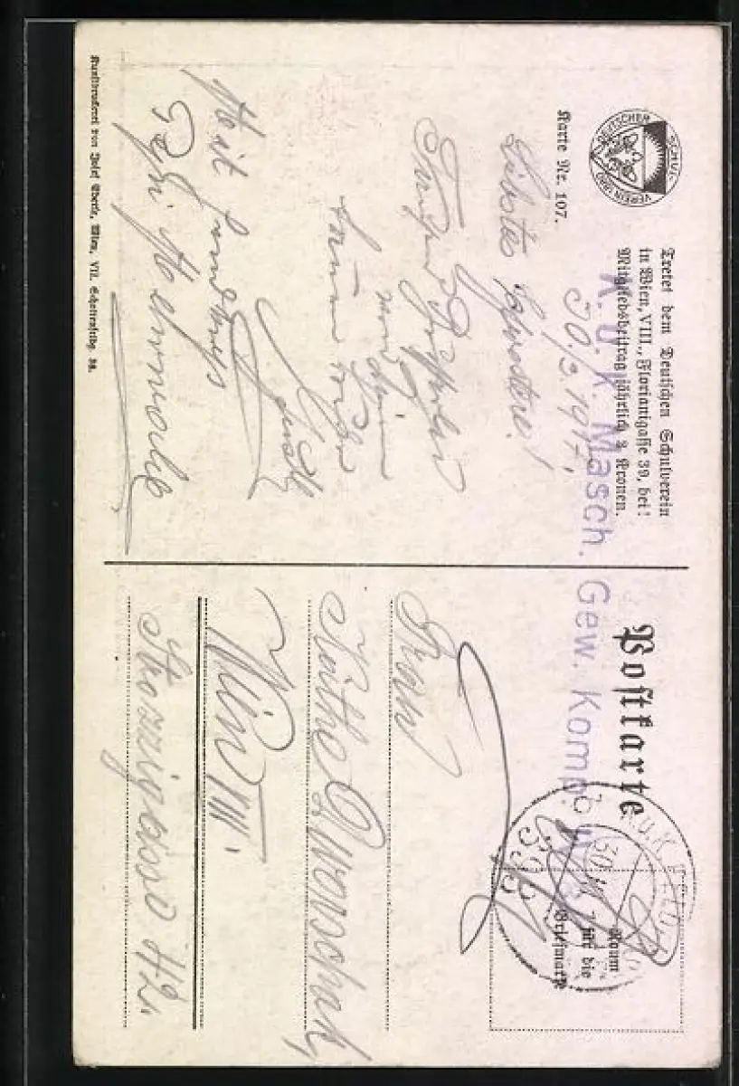 Künstler-AK Karl Friedrich Gsur, Deutscher Schulverein NR 107: Zwei Musikanten mit Violine und Querflöte, Liedzeile