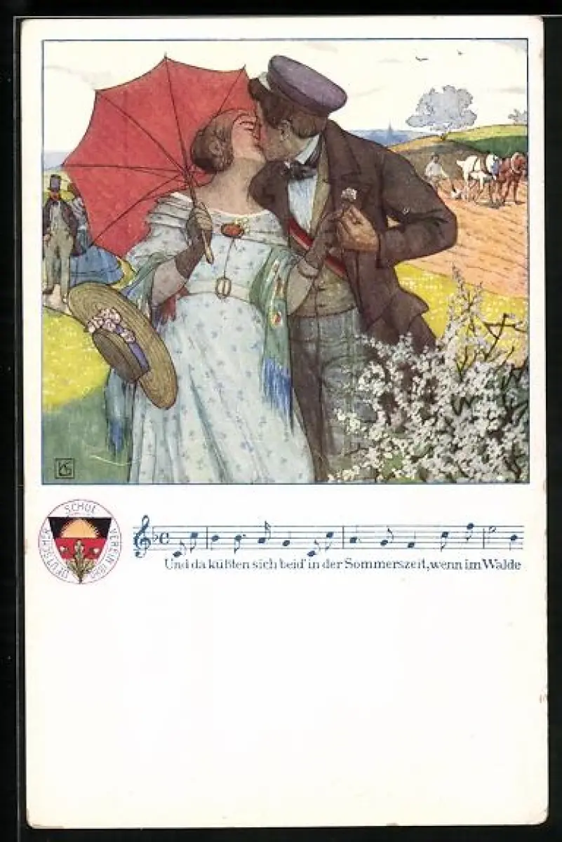 Künstler-AK Karl Friedrich Gsur, Deutscher Schulverein NR 20: Liedzeile und sich küssendes Paar